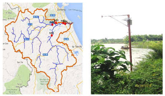 Location (left) and sample picture (right) of hydrological stations in the Vu Gia-Thu Bon river basin.