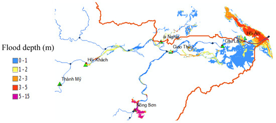Based on the time series analysis of 20 meteorological stations and five hydrological stations in the VGTB river basin as shown in Figure 13 and Figure 14 from August to December 2015, the largest rainfall events occurred on November 3, 2016. The water level predicted by the HEC–RAS model was compared with the precise Digital Terrain Model combined river channels and inundation areas to derive an inundation map showing the spatial extent of the flooding and the water depth at each location. With a processing time of around 5 min, the automated SWAT and HEC–RAS module that simulated flood depth in this event is shown in Figure 15.