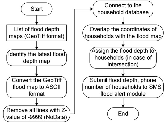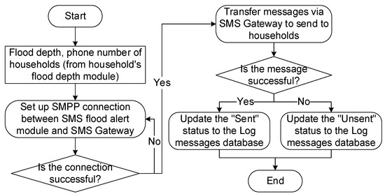 The module automatically collects the location of the household (geographical coordinates) with the flood map and sends flood warning information via SMS. The entire operating procedure of the module is illustrated in Figure 16, including the following steps: From the output data of the HEC–RAS model, the flooded area shows the depth of flood in the form * .tif and conducts a selection of flooding data near the most current time. Then, it converts the * .tif file to * .txt format with three X, Y, and Z fields using the GDAL library (where Z is flood depth). It will filter and delete all lines without data (corresponding to Z value of −9999) then reconcile households in the database with flooding data. If it matches, the module will assign the information that shows the depth to each household and save to the value array including flood depth and telephone number of the household. It activates the flood warning module via SMS. This module sends the flood depth information to the phone number and a warning message to each household. The process of activating the flood warning module via SMS is described in Figure 17.