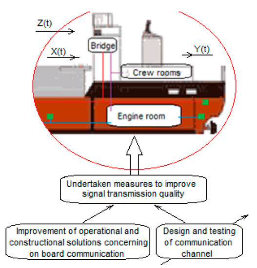 Possibilities of safety improvement on board ships with regards to information exchange depend mainly on the communication effectiveness and reliability and are limited by two principal problems: connectivity of related sensor networks and technology for data transmission. Bearing in mind that communication of a ship can be categorized on the route between source and destination, usually understood as the cases: ship-to-shore, ship-to-ship and the on board case, in this paper the main focus is concentrated on the issue of maritime communication on board (Figure 1). This case provides basic data for the other two cases. A problem is formulated to solve how to reduce the influence of disturbing factors for effectiveness and reliability of maritime on board communication based on the implementation of a wireless sensor network solution.