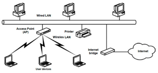 The basic LAN configuration is shown in Figure 5. Typically, two type devices are used in WiFi network: an access point (AP) and user devices. The wireless part of the LAN cannot operate in the ship’s state in the configuration presented, therefore its modification is necessary. Unlike the ZigBee, in typical configuration of WiFi network there is no mechanism for transmitting signals through metal partitions on a ship and the WiFi network is not self-organizing. However, it provides much wider bandwidth and higher data throughput than ZigBee, and can be also easily integrated into a global network, which can be important elements of some measurement or control tasks.