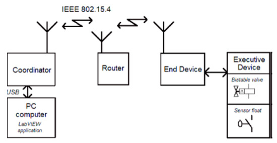 In the first solution, the data from Executive Device (Figure 6), through End Device and Router, is sent wirelessly to the Coordinator that manages the entire ZigBee network, e.g. network initialization, recording of active devices and receiving data from network devices. The Coordinator communicates with the PC via a USB port. The data from the Coordinator is collected and processed in the LabVIEW application. The firmware stack on the End Device has been modified. A set of commands has been added as a support for reading the status of level sensor and identifying commands relating to the valve control module in the Executive Device (Figure 6).