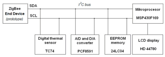 The second exemplary solution, also elaborated in GMU, consists of a wireless communication channel and is supported by autonomously working microprocessor measurement and control system (Figure 7). This system communicates with the ZigBee End Device using the I2C bus. The prototype microprocessor system additionally contains the TC74 temperature sensor, the PCF8591 with 8-bit ADC and 8-bit DAC as well as the 24LC04 EEPROM memory connected to the I2C bus. The microprocessor system is connected via a 4-bit interface with an LCD display (HD 44780 controller). The elaborated peripherals can cooperate with the sensors, transducers and actuators operating as the terminals of a ship safety system. Miniature versions of the End Devices can also serve in the properly configured ZigBee mesh network as the personal identification tags.