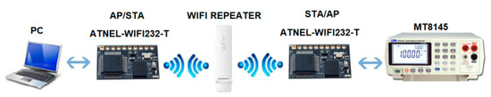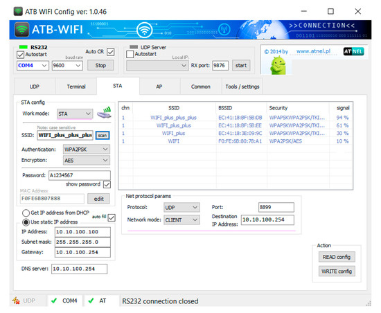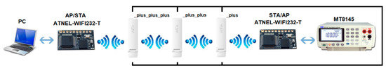 The WiFi network (Figure 9), which is the subject of research, was implemented using several available systems, discussed below. The ATNEL-WIFI232-T modules [23], intended mainly for work in embedded systems, have been used to check the operation of communication of wireless devices in conditions similar to those on the ship. They enable wireless connection with devices equipped with a UART (Universal Asynchronous Receiver-Transmitter) hardware device for asynchronous serial communication over a peripheral device serial port. The UART is available on most microprocessor-based systems. RS232 or USB interfaces, controlled by UART, are the most popular as serial ports of programmable devices. All modern programmable devices, such as measuring instruments and control equipment, have one of these interfaces. Wired RS232/USB adapters are widely available. The MT8145 digital multimeter [24], as the peripheral device, was chosen for wireless communication studies. The instrument is equipped with a RS232 serial interface to connect with the ATNEL-WIFI232-T module, which communicates wirelessly with the second ATNEL-WIFI232-T module connected via an RS232/USB adapter to a PC. In Figure 9, the basic configuration of the established communication link is shown. One of the ATNEL-WIFI232-T modules was configured as an Access Point (AP) and served as a UDP (User Datagram Protocol) server, while the other was set as a workstation (STA) and its role was UDP client. Communication is fully two-sided, so the modules can be swapped with each other without having to change their configuration.