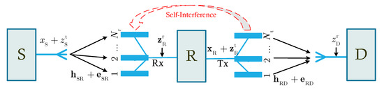 As mentioned in the literature [,,], the transceiver HI is caused by many factors, such as the in-phase/quadrature (I/Q) imbalance, high power amplifier (HPA) nonlinearities at the transmitter, and low noise amplifier (LNA) filters at the receiver [,,]. Various compensation algorithms were applied to reduce the influence of the HI, but these methods could not remove HI completely. The residual HI still exists because of the time-varying and random hardware characteristics. Particularly, the HIs at the transmitters and the receivers after applying compensation algorithms can be modeled as Gaussian distributions [,,], i.e., , , and , where, , , and respectively indicate the HI levels at the transmitters S and R and the receiver R; and are respectively the average transmission power per one antenna of S and R.