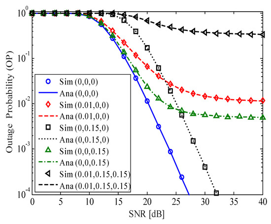Figure 2 shows the OP of the considered HI-FD-MIMO relay system versus the average for different values of , k, and l. The expression (12) is used to obtain the analysis curves and is verified by Monte-Carlo simulation results. In Figure 2, the triad (.,.,.) denotes (). For example, means , , and . We can see from Figure 2 that, compared with the perfect case (i.e., ), the impacts of I-CSI, I-SIC, and HI are very strong. Among the considered parameters, the impact of I-CSI on the OP of the considered system is the strongest. In the case of , the OP goes to the error floor faster at with . In the case of , the OP also reaches the error floor at . However, the value of is lower than that in the previous case. In the case of , the OP of the considered system has the same pattern with the perfect case. Although 5-dB-higher SNR is needed in comparison with the case of at , the OP avoids reaching the error floor in the considered SNR range. When the three factors are imperfect (the case of ), the OP only reaches the outage floor of . Therefore, all solutions must be applied for the considered system to reduce the channel estimation error, HI, and RSI levels.