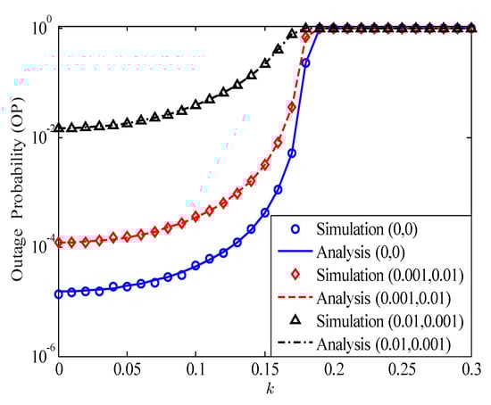 Figure 3 depicts the impact of HI level k on the OP of the considered HI-FD-MIMO relay system for different values of and l. The dyad in Figure 3 denotes and l, e.g., means and . It should be noted that, when , we obtain the OP of the ideal hardware system. We can see from Figure 3 that, in the case of , the impact of the HI on the OP is very small and can be neglected. However, when , the impact of the HI becomes stronger. Especially in the case of , the OP performance is reduced approximately ten times compared with the case of . With a higher value of k, e.g., , the OPs of the considered system go to 1 even with P-CSI and P-SIC (the case of ). Therefore, we need to apply all various solutions in both analog and digital signal processing to compensate for the hardware impairments for the FD-MIMO relay system.