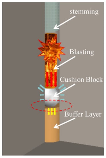 Excavation shaping and the damage-control technique for a rock foundation involves a shock-relieving structure (consisting of a spherical energy-relieving block with high sonic impedance and a flexible cushion with low sonic impedance) placed at the bottom of a borehole. Stress transmitted to the base protection layer is laterally gathered to the bottom of the blast hole and to the upper rock mass through the reflection effect of the high-sonic-impedance spherical energy-relieving block to strengthen the fragmentation between the upper and adjacent rock mass. Meanwhile, the reflection of the energy-relieving block and the isolation of the lower loose-sand layer are used to reduce the blasting damage of the bedrock mass at the bottom of the hole. The application of this technology in the blasting construction of foundation excavation can strengthen rock fragmentation in the horizontal direction, improve the one-time forming effect of the excavation surface, reduce the scope of blasting damage in the direction of the retaining rock, ensure the quality of foundation excavation, and improve construction efficiency. Figure 1 shows a typical energy-relieving structure that has been widely used in the excavation of dam foundations. However, the application of this method in underwater drilling and blasting has not been reported.