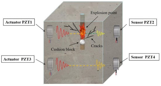 Lile any other piezoelectric material, PZT has a direct piezoelectric effect and an inverse piezoelectric effect. PZT transducers can be embedded in or bonded on a concrete structure for health monitoring [62,63,64]. In this research, a PZT-based active-sensing method is proposed to monitor blast-induced damage in a concrete structure; Figure 3 illustrates this principle. There were two pairs of the PZT transducers bonded on the outer surface of the specimen. One pair was placed above the explosion point, which was at the center of the specimen, and another pair was placed below the explosion point and cushion block. It was expected that the top part of the concrete specimen would experience damage due to the blast. The bottom part of the specimen would experience less damage due to the cushion block that absorbs blast energy. For the top pair of PZT transducers, under an excitation signal, the PZT actuator generated a stress wave due to the inverse piezoelectric effect, and the stress wave propagated in the concrete specimen. The PZT sensor transformed the measured stress wave into electrical-signal output due to the direct piezoelectric effect. Because of damage in the structure, the amplitude, energy, propagation time, mode, and waveform of the signal changed. By comparing the signals to those of the healthy state of the structure, we could determine whether the structure was damaged, and with further analysis, the location and degree of the damage. In the upper part of the specimen, due to the existence of cracks in the specimen, the amplitude and energy of the piezoelectric signal received on the right side were smaller than those of the bottom part under the same signal excitation on the left side.