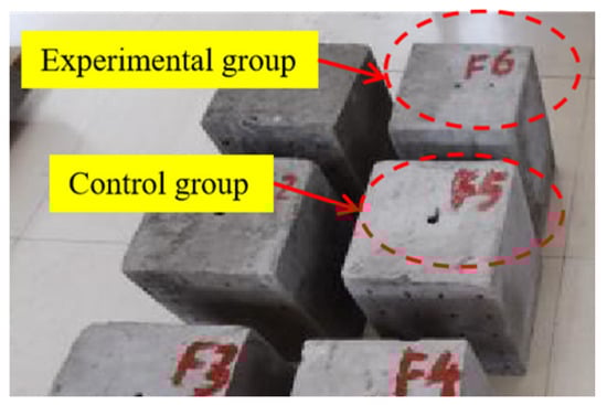 The comparative method was used to test the effect of the energy-relieving structure. Two C30 concrete cubes with 245 × 245 × 300 mm dimensions were prefabricated, as shown in Figure 4. Steel bars with a diameter of 12 mm and a length of 100 mm were embedded at the center of the top surface perpendicular to the base surface. The steel bars were removed after the specimens were cured for 12 hours, and 12 × 100 mm blast holes were formed after the specimens were completely hardened (after curing for 28 d). Six standard samples (100 × 10 × 100 mm) were poured to test the compressive and tensile strength of concrete. The basic mechanical parameters of C30 are listed in Table 1.