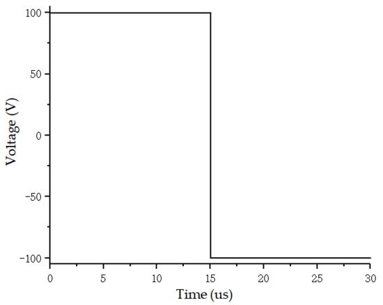 The multifunctional piezoelectric signal-detection and -analysis system is shown in Figure 5. This system had two transmitting channels and eight receiving channels. The transmitting signals were divided into pulse signals and analog signals. The amplitude, frequency, and time-holding of the transmitted signal could be freely adjusted. The transmission signal was a single pulse signal with a pulse amplitude of 100 V, pulse width of 15 μs, encoding bit of 2, duration of 30 μs, and sampling rate of 2 MHz, as shown in Figure 6.