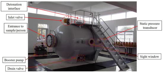 To simulate underwater drilling blasting, we used the horizontal water-medium explosion vessel, as shown in Figure 7. The explosion vessel was 2 m in diameter, 2 m in length, and 0.5 m at both ends. Two 280 mm (diameter) sight windows in opposite directions, one a manhole with a diameter of 500 mm, and one a detonation interface with a diameter of 300 mm, two cable outlets with a diameter of 280 mm, one static pressure test port, electric pressure, and pressure-relieving ports, electric water inlet and outlet ports, were set in this explosion vessel. One pressure test pump was connected to the pressure port with a power of 2 m³/min. The explosion vessel could simulate an explosion of 10 g TNT in 200 m depth (with pressure of up to 2 MPa). The simulated depth used was 40 m (0.4 MPa).