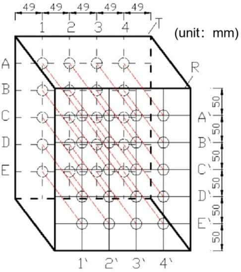 The initial states of Specimens F5 and F6 were measured by the wave-based method before blasting. As shown in Figure 8, four points (1–4) were taken in the horizontal direction, and five points (A–E) in the vertical direction with column and row spacing of 49 and 50 mm, respectively; a total of 20 points were tested. These points were determined in advance and marked using paint. During the test, the actuators and sensors were affixed on the measuring points using Vaseline.