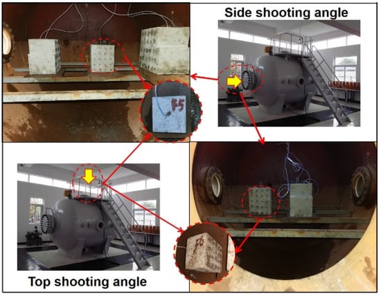 In Specimen F5, the blast hole was filled with coarse sand to 70 mm, and a steel ball with a diameter of 10 mm was the placed inside. Then, the charge consisting of one No. 8 steel detonator and 2 g pentaerythritol tetranitrate (PETN) was added, and the blast hole was blocked with soft blast mud. In F6, the blast hole was first filled with fine sand to 70 mm; then, the charge consisting of one No. 8 steel detonator and 2g PETN was filled, and the blast hole was plugged with soft clay. The specific scheme is summarized in Table 2.