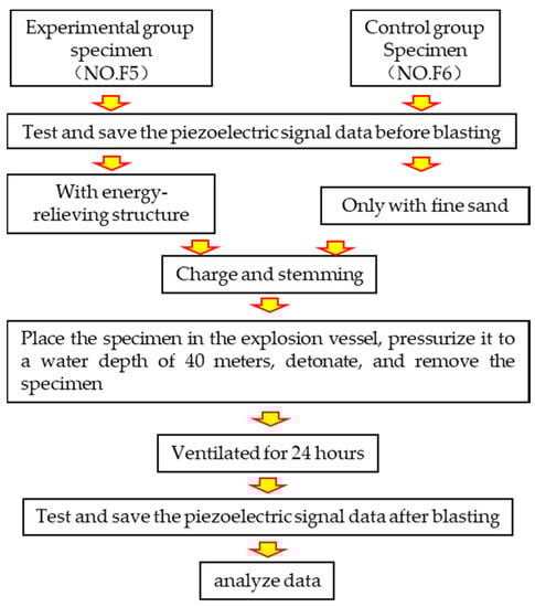 The two specimens were filled according to the experiment plan shown in Table 2, with the energy-relieving ball, charge, and stemming installed. The specimen was placed in the water-medium explosion vessel, which was sealed and filled with water, as shown in Figure 9. Then, the pressure-valve switch was turned on, and static pressure was adjusted to reach 0.4 MPa. The pressure pump was later stopped, and the pressure valve was closed. The detonation line was connected to the detonator, and the system was detonated. Finally, pressure was released, water was drained, and the sample was removed. The specimen was placed in aeration for 24 hours, and piezoelectric data were obtained after blasting. The entire experiment procedure is shown in Figure 10.