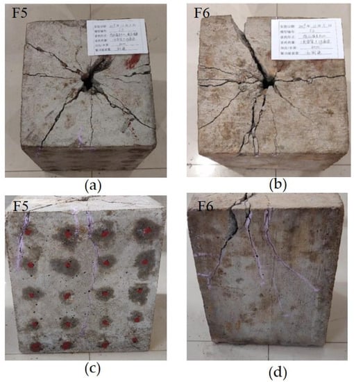 As shown in Figure 11, cracks appeared on the upper surface of F5 (Figure 11a) and F6 (Figure 11b) when the specimens were taken out after blasting. Both specimens developed cracks at the upper section, whereas the bottom of the specimens withstood the pressure. Upper surface crack and crack width in F5 with the energy-relieving structure were more uniform than those in F6, and the number and length of side cracks in F5 were less than those in F6, as shown in Figure 11c,d.