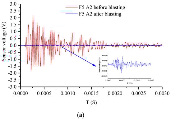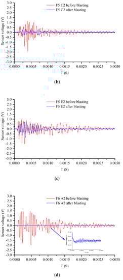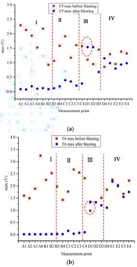 The peak value of piezoelectric signals at various measurement points of Specimens F5 and F6 before and after blasting are shown in Figure 13a,b. The entire curve could be divided into four sections according to the position of the blast hole and the graph of voltage-signal peak: The first section was where the blast hole was located, i.e., the area 8 cm below the upper surface of the specimen, where the cracks were obvious after blasting. The signal peak substantially lay on the same horizontal line after blasting; this showed that most of the energy was absorbed due to the cracks, and only a fraction of the energy was sensed. This section could be defined as the crush zone. The second section is the area defined as the fracture zone (8–15 cm below the blast hole), where a few closed fractures still took place. The peak value of the waveform fluctuated after blasting. Following the fracture zone was the zone where the surface of the specimen was crackfree, and the peak (15–20 cm below the hole) was similar to that of the fracture zone, meaning that energy loss was minimal; this area was defined as the damage zone. The 10 cm deep region at the bottom of the specimen was defined as the safe zone, where the peak value of the waveform remained unchanged after blasting, indicating that this area was not affected.