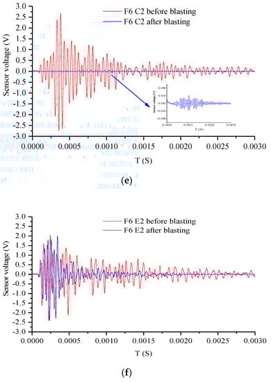 Measured-waveform-based active sensing was performed before and after blasting, as shown in Figure 12a–f. The amplitude of the wave became larger from the top to the bottom of the blast hole and the bottom of the specimen, respectively, indicating fewer internal cracks in the concrete cube. F5 had a certain amplitude waveform at C2, while it was still a horizontal line for F6 at C2 after blasting. The damage depth of F6 was larger than that of F5, demonstrating that the energy-relieving structure protected against rock damage at the bottom of the specimen.