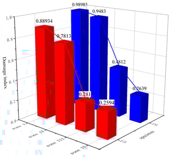The energy of each subsignal could be obtained using Equation (2). Thereafter, according to Equation (3), the η values of F5 and F6 were calculated, and the average values for Zones I–IV were calculated. The histogram of the damage index of each zone is shown in Figure 14.