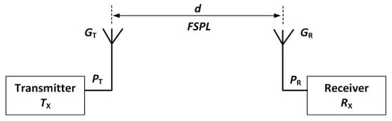 Free space path loss (FSPL) is a function of the free-space wavelength (λ0) of the radio signal and the separation between two antennas, as shown in Figure 1. The term TX represents the transmitter, and RX represents the receiver, and the separation between the two is denoted as d. The transmitted power is denoted as PT, the received power is denoted as PR, and the gain of the transmitting and receiving antenna is denoted as GT and GR, respectively.