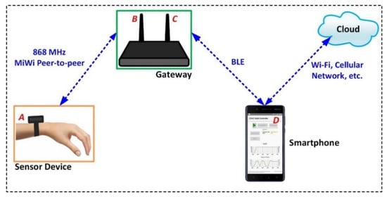 Wireless communication is a key technology in continuous sensing and monitoring the health conditions of a person []. Generally, the sensing device has a limited computation and processing capability, and typically, an additional processing unit is incorporated for data processing []. Further, a series of operations such as data visualization for the end-user, and transmitting the measured data to other centers can be accomplished using a smartphone application [,,]. Typically, wearable healthcare sensors and systems require constant accessibility and operation of the sensed data []. Advancement in cloud computing technology offers a great opportunity to transmit the sensor data to the IoT cloud, and when required, an authorized user can easily access the data with any internet-connected device [,,].