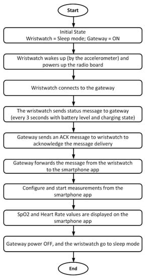 One version is executed in the radio module of the wristwatch, and the second version was executed in the radio module of the gateway. In both the devices, the application-specific code, and the network protocol code reside within the same microcontroller. In Figure 4, the workflow diagram of the system is illustrated. In the initial state, the wristwatch sensor device is in the sleep-mode. The gateway is assumed to be powered ON in the initial state of the process. The wristwatch wakes up when a movement is detected by the accelerometer embedded in the processing board. At this stage, the processing board powers up the radio board, and the wristwatch connects to the gateway. Now, the wristwatch sends a status message with the battery level and charging state of the wristwatch to the gateway every three seconds. When the status message is received at the gateway, the gateway sends an acknowledgement (ACK) to the wristwatch. Further, the gateway forwards the message from the wristwatch to the smartphone application (user interface). Concurrently, the end-user can send the control commands from the smartphone to configure (measurement duration and patient ID), to start, or to stop a measurement.