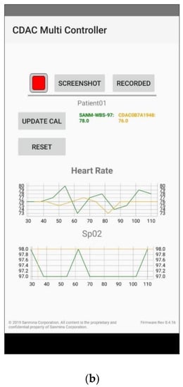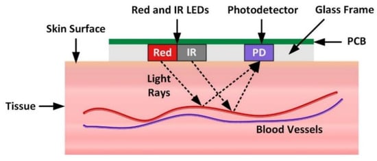 As shown in Figure 5, all the electronic components, such as LEDs and PD, are populated on a printed circuit board (PCB) and encased in a glass frame, as shown. The pulse signal obtained from a PPG sensor comprises an AC (pulsatile) and a DC (slowly varying) component. The AC component is attributed to changes in the blood volume synchronous with each heartbeat, whereas the DC component is related to respiration, tissues, and average blood volume [].