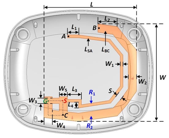 This section presents the design, fabrication and measurement of a compact 868 MHz wristwatch-integrated antenna. The design of a compact sub-GHz antenna to fit into a small area contained within a wristwatch device is challenging due to size constraints. In this case, the challenge is to integrate an antenna with a guided electrical length of 57 mm or approximately λg/4 in a wristwatch device. The key performance parameters of the antenna, such as gain, efficiency, and bandwidth are fundamentally limited by the antenna size []. The geometry of the proposed antenna is shown in Figure 6. The antenna has a modified planar inverted-F (PIFA) topology. The antenna is excited at point S using an unbalanced feed with respect to the ground signal at point G. The signal is applied from the radio board using two contact springs at points S and G. The antenna topology is comprised of two resonators, R1 and R2, for improving the radiation performance of the antenna. The particular shapes of R1 and R2 were designed in order to keep the resonators away from the internal conducting components of the wristwatch device. An inductive shunt section between points S and G has been used to improve the impedance matching of the antenna by compensating the capacitance of the resonating arms R1 and R2 that are in close proximity to the ground plane.