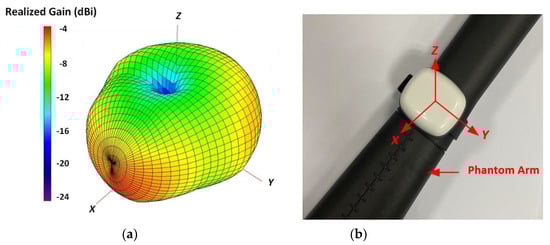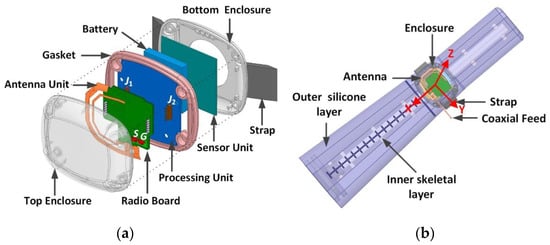 Figure 7a shows the exploded view of the wristwatch case model used in the electromagnetic (EM) simulations. The wristwatch case includes all the internal components of the device, such as a sensor unit, processing unit, radio board, and connectors. For the demonstrated system, the wristwatch casing is a modified, off-the-shelf assembly and is IP-65 rated [], and contains an integrated rubber gasket between the bottom and bottom enclosure assemblies. The rubber gasket ensures a waterproof seal between the top and bottom enclosure. The connectors J1 and J2 join the processing unit to the sensor unit and the radio board. The contact springs denoted as S and G on the radio board, as shown in Figure 7a, connect respectively to the points S and G on the antenna structure, as shown in Figure 6. The simulation model, where the wristwatch device is placed on a commercial SHO-GFPC-V1 phantom arm from Speag [], is shown in Figure 7b.