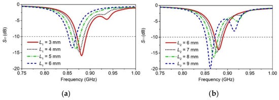 Simulated S11 response: (a) for varying L1, (b) for varying L2.