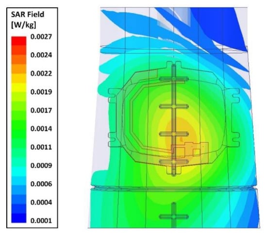 In Figure 9, the simulated specific absorption rate (SAR) of the proposed wrist-worn antenna on a Speag phantom arm at 868 MHz is shown []. The simulation environment for the SAR evaluation of the antenna is illustrated in Figure 7b. The peak SAR point on the phantom arm is located near the feed point of the antenna. For an input power of 1 mW, a peak SAR of less than 0.003 W/kg was demonstrated. This figure is less than 0.1% of the maximum permissible SAR limit of 4 W/kg averaged over 10 grams of wrist tissue [].
