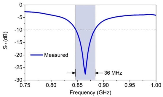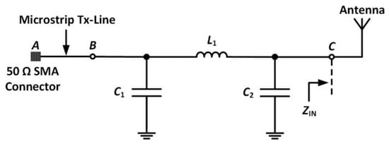 The input impedance (ZIN) of an antenna is a key design parameter that determines the reflection coefficient and the impedance bandwidth of the antenna []. In this section, an impedance-matching network to reduce the antenna reflection coefficient while also improving the impedance bandwidth of the antenna is presented. The matching circuit shown in Figure 10 ensures the maximum power transfer from the source (A) to the antenna and maintains the desired performance even under small detuning effects []. First, a vector network analyzer [] was used to measure ZIN, which was later used to design an optimal matching network for the antenna.