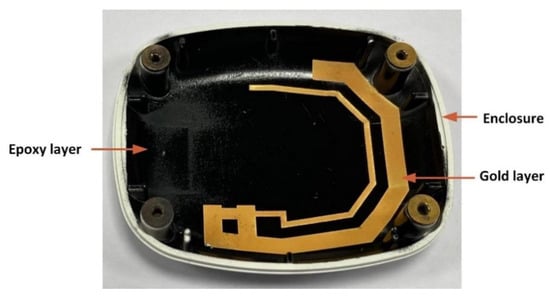 The overall antenna structure is printed on the surface of a wristwatch enclosure using the LDS method. The wristwatch enclosure is made of an acrylonitrile styrene acrylate (ASA) material, which has a measured relative permittivity of εr = 2.9 and a loss tangent of tanδ = 0.033 at 868 MHz. The electrical properties of all the dielectric materials were measured using a dielectric assessment kit (DAK) from Speag []. The maximum dimension of the antenna is 35.2 × 33.4 mm, and the total dimension of the wristwatch enclosure case is 53.9 × 44.8 × 17 mm.