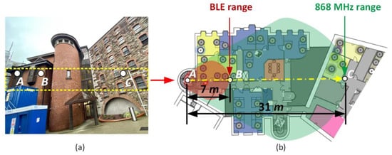 In Europe, the maximum effective radiated power limit at 2.45 GHz for the BLE devices (for example, BLE 4.0) is 10 dBm, and at 868 MHz, the limit is 14 dBm [,,]. In Table 1, the parameters required to calculate the theoretical free-space wireless communication range at 868 MHz and BLE 4.0 are listed.