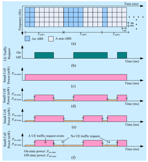 (a) an illustration for the time-domain ABS based eICIC technique for CCI management; (b) A UE traffic request over time; (c) without applying the DTX power mechanism to SBSs and the ABS based eICIC technique; (d) with applying the DTX power mechanism to SBSs and without applying the ABS based eICIC technique; (e) without applying the DTX power mechanism to SBSs and with applying the ABS based eICIC technique; (f) with applying the DTX power mechanism as well as the ABS based eICIC technique to SBSs.