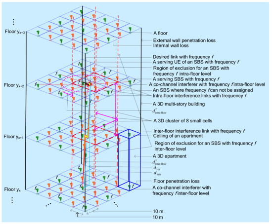 Referring to Figure 4, a 3D cluster of SBSs can be formed by allowing a minimum distance between SBSs located on the same floor as well as different floors of a multistory building subject to satisfying a minimum CCI level at an in-building UE, which is caused by one co-channel SBS to another due to reusing the same frequency to them. Assume that there is a uniform deployment of SBSs per building within a macrocell, and each apartment of any building has an SBS deployed in the middle of its ceiling. Then, following [43], the minimum distances in intra-floor and inter-floor levels can be expressed by (7) and (8) as follows where and represent the maximum allowable aggregate CCI in intra-floor and inter-floor levels respectively; represents a reference distance for the normalization of intra-and inter-floor interference; and and represent the maximum number of intra-floor and inter-floor co-channel SBSs, respectively: