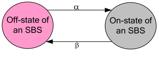 According to [48], call arrivals or sessions can be modeled as a Poisson process. Since the transmission power of an SBS is switched on and off based on its UEs’ traffic requests, the transmission power of an SBS can be modeled as exponentially distributed continuous-time Poisson process such that the duration of any state of an SBS is exponentially distributed. Assume that each SBS has the maximum number of UEs of one. Since a UE would have either a traffic request or not at all at any time, a UE has only two states. Moreover, the switching of an SBS varies according to the variation in UE traffic requests such that an SBS also has two states. Since given the present state of an SBS, the future state is independent of the past such that the on-and off-state transitions of an SBS can be modeled as a two-state Markov chain as shown in Figure 6 where denotes off-state to on-state transition rate, and denotes on-state to off-state transition rate of an SBS.