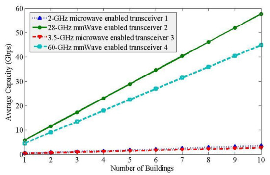 Due to considering an average performance estimation and relatively a less variation in channel characteristics such as the Doppler speed and the delay spread, particularly in high frequencies and in indoor environments, we consider an identical channel propagation characteristic for both microwave and mmWave spectra of each SBS per building for simplicity. Let denote a set of transceivers per SBS such that . Hence, for a single building, i.e., L = 1, the aggregate capacity achieved by all four transceivers of an SBS s is given by: