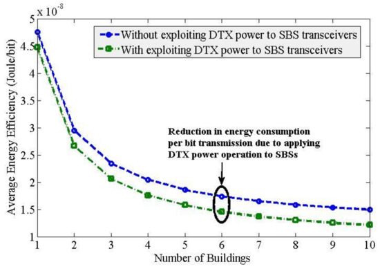 Table 3 shows SE and EE performances of OSS and nOSS techniques in comparison with 10 times, as well as 100 times, that of 4G mobile systems. It can be found that for certain values of L, i.e., the number of times of horizontal spectrum reuses on 2D space on Earth, irrespective of the number of times of vertical spectrum reuses per building, i.e., and application of the DTX power to SBSs, both OSS and nOSS techniques can achieve 10 times, as well as 100 times SE and EE of 4G mobile systems. Further, nOSS requires less number of times of horizontal spectrum reuses L than OSS due to vertical reuse of spectrum in inter-floor level more than once per building in nOSS. Furthermore, the value of L*, satisfying both SE and EE requirements, is defined solely by the requirement for SE, for both OSS and nOSS, regardless of the value of and the use of the DTX power to SBSs. It is to be noted that, with an application of the DTX power, the energy consumption per bit can be reduced for both OSS and nOSS, irrespective of the value of .