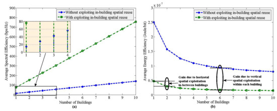 Secondly, by exploiting spatial-domain, the same set of spectra can be reused to each horizontally separated multiband enabled SBS on 2D space of earth. Moreover, due to the floor and internal wall penetration losses, vertically separated SBSs located on different floors of a building can be grouped under certain constraints to form 3D clusters of SBSs both intra-floor and inter-floor levels such that the whole spectrum of any band can be reused to SBSs of each 3D cluster. Hence, by considering both horizontal and vertical spatial exploitation, the same set of spectra can be reused to both horizontally and vertically separated multiband enabled SBSs more than once to improve both SE and EE performances as shown in Figure 9.