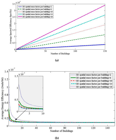 Equation (9) signifies that due to exploiting the spatial-domain reuse of spectrum in a 3D building of SBSs, the same spectrum can be reused by a factor , also termed as 3D spatial reuse factor, that can be expressed as follows: