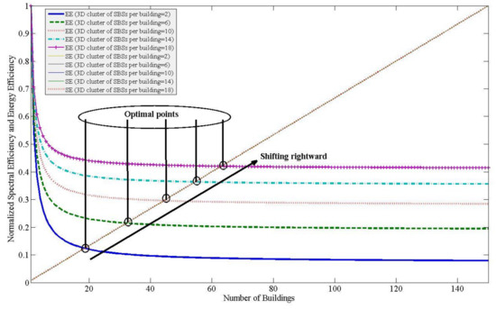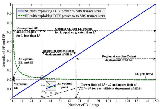 Hence, multiband enabled, DTX power controlled, and ABS-based eICIC technique employed in-building SBSs can be set for optimal performance of both the SE and the EE by reusing multiple spectra to each SBS both horizontally on 2D space on Earth and vertically within any building such that the normalized SE and EE performances of SBSs are equal to each other. The number of times of reusing a spectrum to each SBS both horizontally and vertically, which results in no further improvement in the EE performance, defines the upper limit of reusing the spectrum in terms of L to SBSs for a cost-efficient deployment of SBSs for a given value of as shown in Figure 11.
