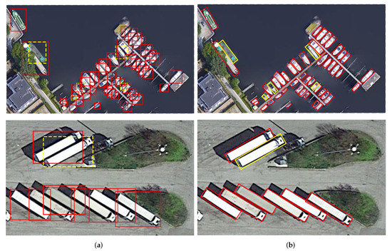 (a) HBB detection of densely-distributed and strip-like objects with large redundancy regions; objects in yellow line of dashes are prone to missed detection; (b) OBB detection is suitable; objects in yellow line can be detected rightly with fitting regions.