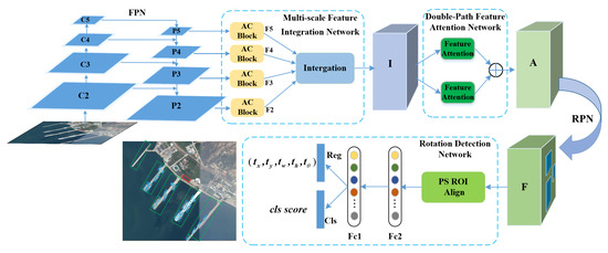 Overview framework of Multi-scale Feature Integration Attention Rotation Network (MFIAR-Net) for oriented object detection. The proposed framework based on FPN, consists of Multi-scale Feature Integration Network, Double-Path Feature Attention Network and Rotation Detection Network.