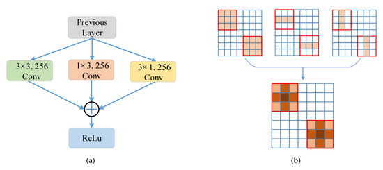 (a) The structure of Asymmetric Convolution Block (AC Block) with three parallel convolution layers with , and kernels. The ReLu activation is operated on the sum of them.; (b) The AC Block focuses on the significance of skeletons feature of ‘+’ shape.