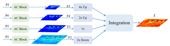 The FPN plays an important role in multi-scale feature extraction. Inspired by the “feature balance” from the Libra RCNN [17]. The FPN method will make fused features focus more on adjacent resolution but less on others. The semantic information contained in non-adjacent levels would be diluted once per fusion during the information flow. So, our study focuses on the good manner of feature balance designed for remote sensing images. The multi-level features F2, F3, F4, F5 are strongly attained after the AC Block. Low-level and high-level informations are complementary for object detection. How to make full use of multi-level features to generate more discriminative representations is crucial to detection performance. As indicated in Figure 5, F2 possesses the highest spatial resolution, F5 possesses the lowest spatial resolution. Aiming to integrate multi-level features and maintain their semantic hierarchy concurrently, we first resize the multi-level features F2, F3, F4, F5 to an intermediate size by using bilinear feature interpolation method. By introducing the expected size of integrated features, SCRDet [33] explored that the small stride of the anchor () can obtain more samples with high quality particularly for the small objects. Meanwhile, is equivalent to the reduction factor of the feature map relative to the input image. In order to balance the semantic information and location information, we adopt the size of F3 as the integrated size. The integration feature can be obtained by the averaging operation as Equation (1). In this procedure, multi-scale features from high-level to low-level are aggregated at the same time. The output of MFIN integrated semantic and spatial features to strengthen the multi-scale information flow and make features more balanced, which is denoted as I.