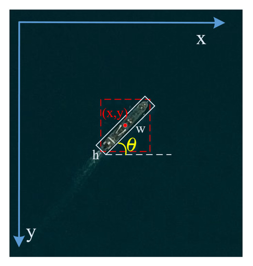 Based on Faster R-CNN [6], the proposed network has two stages. In first stage, the coarse horizontal region proposals are still obtained from RPN. In the second stage, the final predicted OBBs with five parameters from the rotation detection head are regressed. Specially, as Figure 7 shows, is defined as the angle between the x-axis and w side in range . means the oriented box’s center coordinate and w, h represent the width and height of oriented box, respectively. Besides, rotation non-maximum suppression (R-NMS), the rotational variant of NMS, is applied to select the best localized regions and to remove redundant detections for OBBs. In order to build a robust rotation detection with a cute angle , PS RoI Align layer and a new multi-task learning loss function are introduced in the proposed Rotation Detection Network.