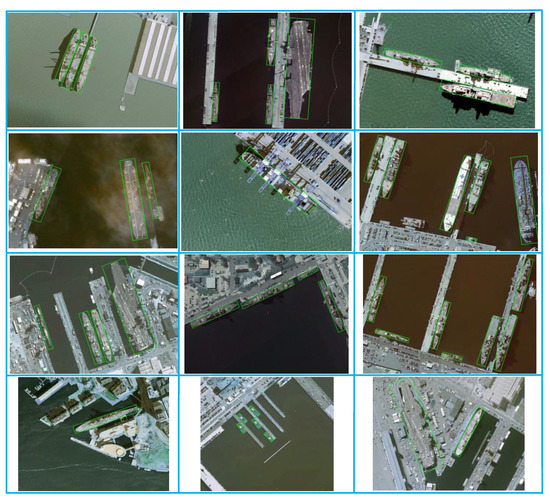 HRSC2016 [37] is a challenging dataset collected from famous harbors in Google Earth for ship detection. The dataset involves 1061 images totally with 436 images for training, 181 images for validation and 444 images for test respectively. The fully annotated HRSC2016 possesses 2976 samples with more than 20 categories of ships in diverse appearances. The image sizes range from to , most of which are larger than . The strip-like ship detection is a better illustration of OBBs.
