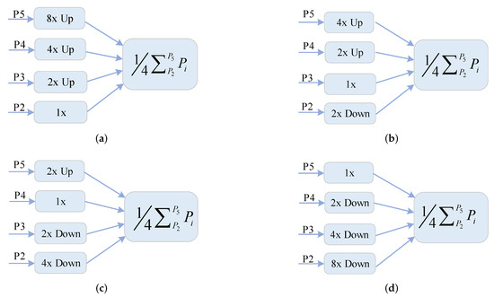 Different integration manners of multi-scale features of P2, P3, P4, P5. (a) The way of Integration into P2; (b) The way of Integration into P3; (c) The way of Integration into P4; (d) The way of Integration into P5. Note that Up and Down represent upsample and downsample operations respectively are achieved by the bilinear interpolation method.