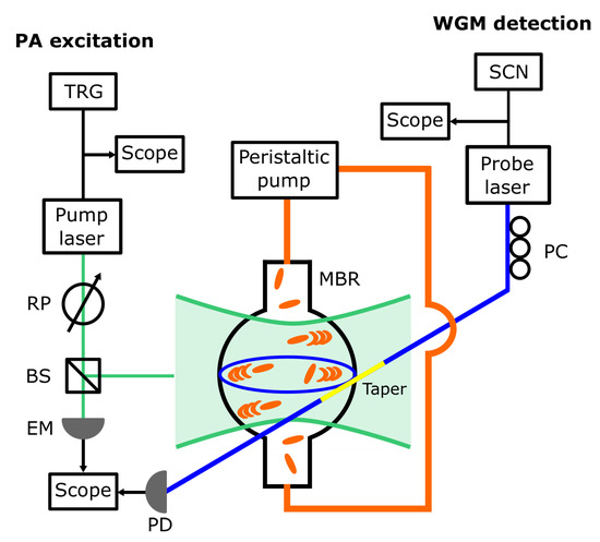 The MBR was also coupled to a home-made tapered optical fiber which allowed a WGM to be excited through a low-noise single-frequency CW fiber laser (probe laser, Koheras ADJUSTICK, NKT Photonics, Birkerød, Denmark; spectral range 1550–1551 nm). The WGM signal was detected through a gain-selectable InGaAs photodiode (PDA400, Thorlabs Newton, NJ, USA; bandwidth 10 MHz). A polarization controller was used to optimize the contrast of the WGM signal. The taper was positioned with respect to the MBR by moving it through a set of micrometer stages and observing its position with a long-working distance microscope (custom model, Navitar, Rochester, NY, USA, not shown in Figure 1).